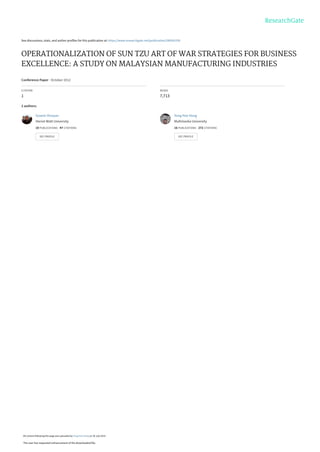 This document discusses operationalizing Sun Tzu's Art of War strategies for business excellence in Malaysian manufacturing industries. It reviews literature on applying Sun Tzu's military strategies to business and identifies gaps in empirically testing dimensions. The study aims to develop measurable dimensions representing Sun Tzu's strategies for manufacturers. A model is tested using survey data from 300 firms and statistical analysis supports four key dimensions: employee motivation, market knowledge, strategic planning, and effective leadership.