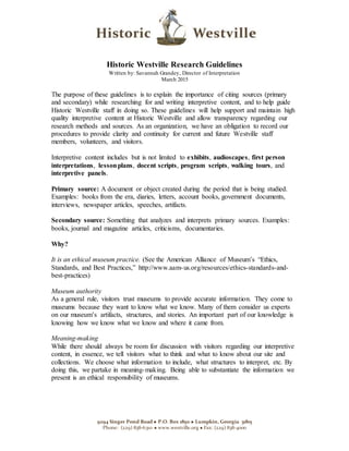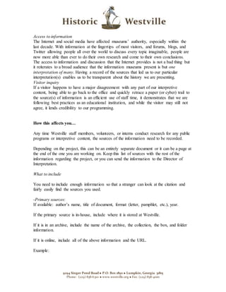 The document provides guidelines for staff at Historic Westville on citing sources when conducting research and developing interpretive content. It explains that properly citing primary and secondary sources is important for maintaining high quality, transparent interpretations and meeting ethical standards. Staff are instructed to record all sources used in research, including enough information like author, title, date, and location so others can easily find the sources. Citing sources allows the organization to substantiate its historical interpretations, respond to any public inquiries or disagreements, and demonstrate that it is following best practices for an educational institution.