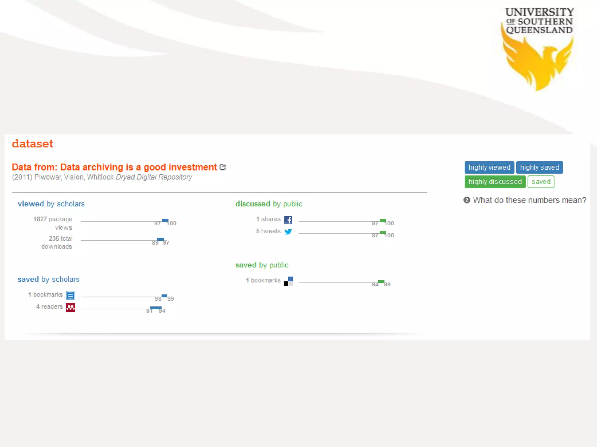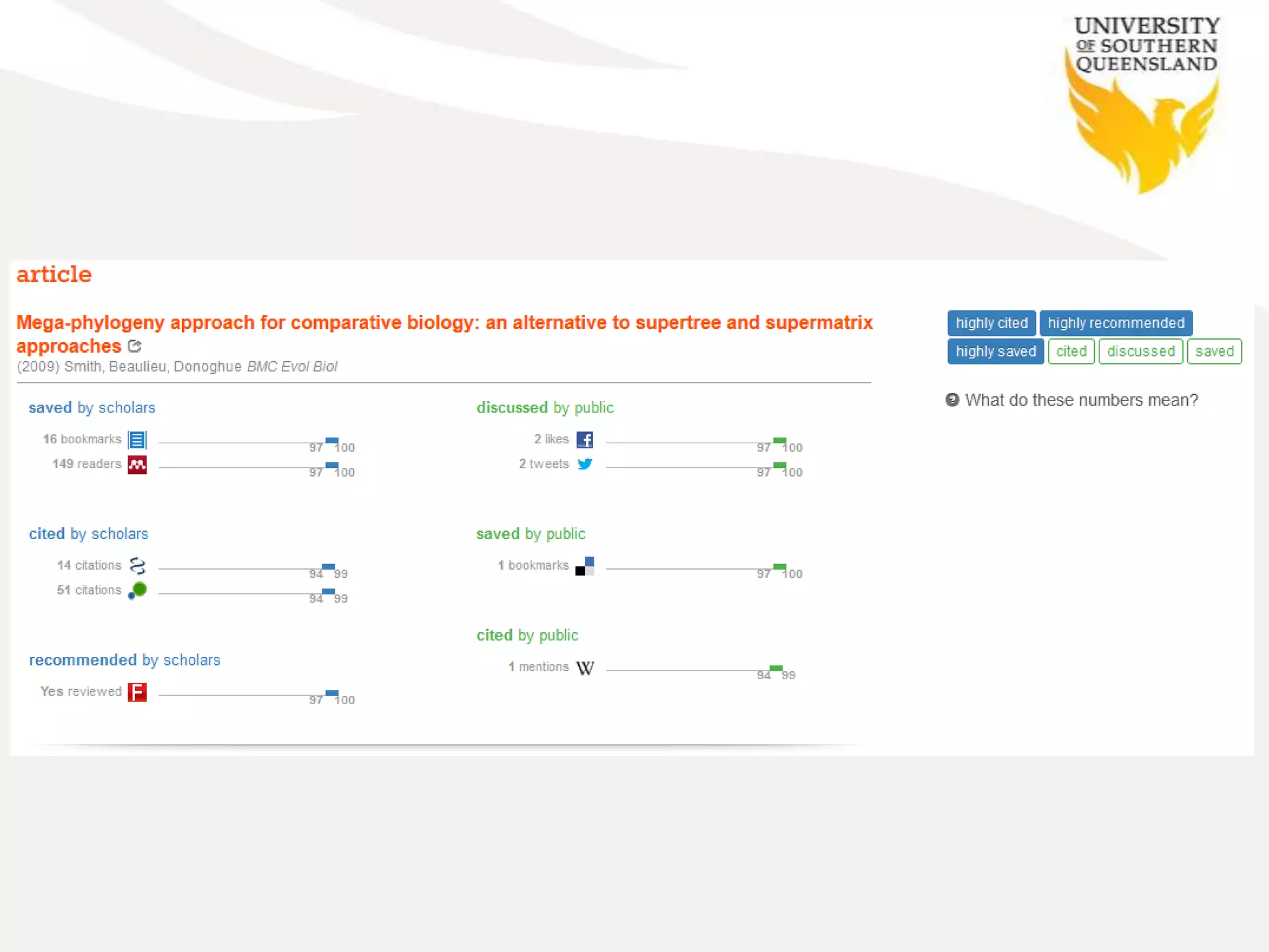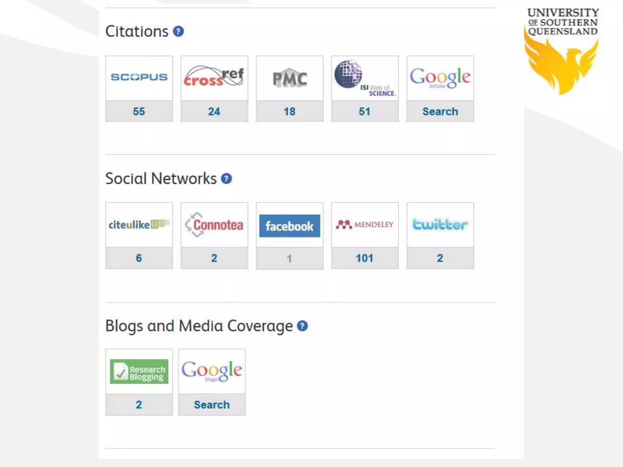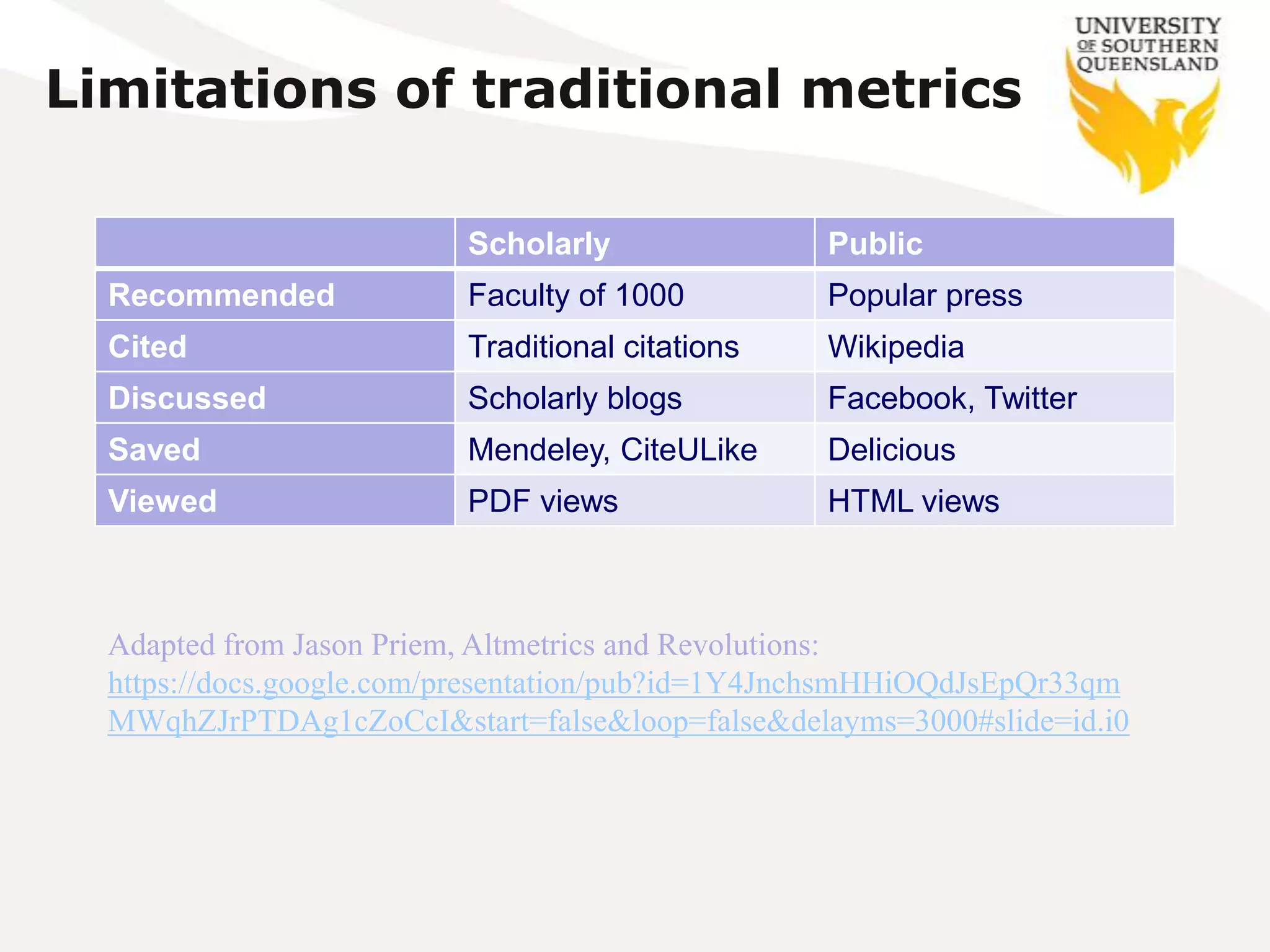 The document discusses the limitations of traditional research impact metrics and the significance of altmetrics for measuring scholarly impact through social media and web interactions. It presents various generations of impact metrics, such as journal, author, and article-level metrics, and introduces the NCP calculator developed by USQ for normalizing citations. It emphasizes the importance of a holistic impact management system to effectively monitor and report research impact beyond academia.