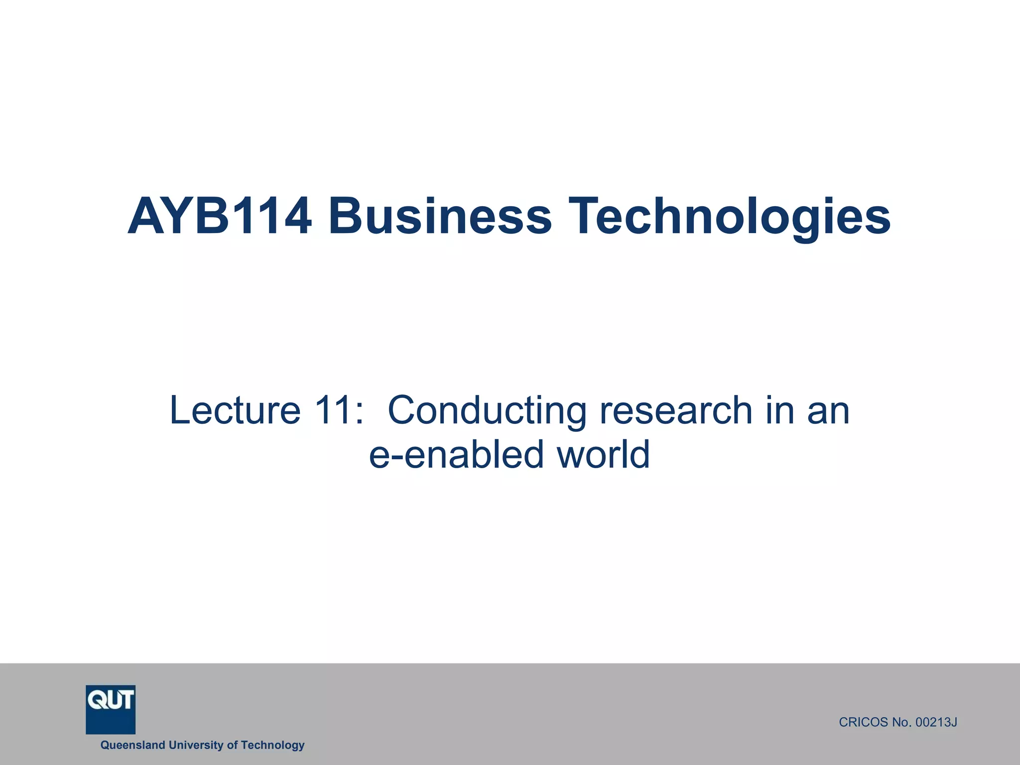 Lecture 11 addresses conducting research in an e-enabled world, emphasizing the importance of properly evaluating online resources. It provides tools for complex searches, bookmarking, and citation while highlighting the need for lifelong learning in response to rapid changes in information accessibility. Key topics include evaluating the quality of sources, understanding intellectual property rights, and using various e-research tools effectively.