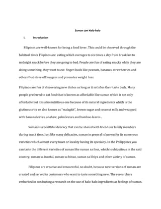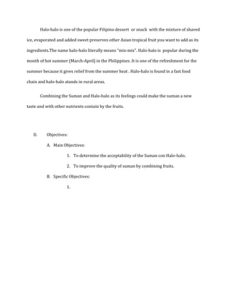 Filipinos enjoy eating frequent small meals and snacks throughout the day. Suman, a traditional Filipino snack made of glutinous rice, brown sugar, and coconut milk wrapped in banana leaves, is both affordable and nutritious. Researchers developed a new version of suman called "Suman con Halo-halo" by adding the ingredients of halo-halo, a popular Filipino dessert of shaved ice, evaporated milk, and tropical fruits, into suman. Their objectives were to determine the acceptability of Suman con Halo-halo and improve the quality of suman by combining it with fruits.
