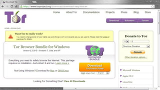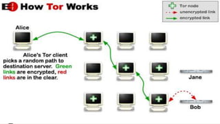 The document discusses the deep web and dark web. The deep web includes privately hosted websites and databases that are not indexed by search engines. The dark web is intentionally hidden and can only be accessed using software like Tor, which encrypts internet traffic to maintain anonymity. While the dark web can enable privacy and whistleblowing, it is also used for illegal activities due illegal goods and services due to its anonymity. Tor works by bouncing communications through a network of volunteers servers around the world to hide a user's location and usage.
