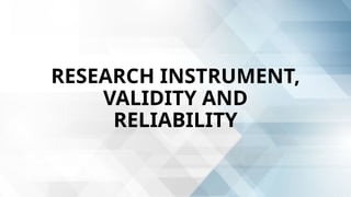 The document discusses the components of effective research instruments, emphasizing valid and reliable data collection methods such as questionnaires and performance tests. It outlines characteristics of good instruments, ways to develop them, and types of validity and reliability along with experimental design principles. Additionally, it highlights the importance of adhering to research ethics, including informed consent and participant confidentiality.