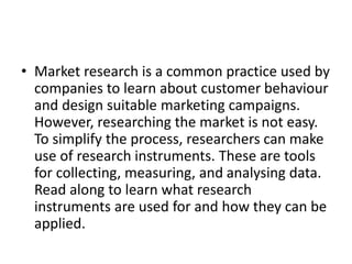 A research instrument is a tool used to collect and analyze data in research. Some common examples include interviews, questionnaires, surveys, and checklists. Interviews can be structured, unstructured, or semi-structured and involve asking participants questions to obtain qualitative data. Surveys are similar but are often distributed as paper or online forms rather than in-person. Observation is another instrument that involves watching people interact to collect data in a controlled or uncontrolled environment. Research instruments help simplify the process of conducting market research and learning about customer behavior.