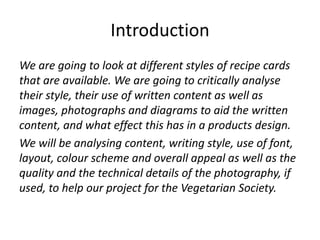 This document analyzes and summarizes the styles of various recipe cards from different organizations. It examines aspects like layout, use of images and text, font styles, and overall design appeal. Key elements that make for clear, easy to follow recipes are identified, such as breaking methods into numbered steps. Areas for improvement in some cards are also noted, such as removing unnecessary introductions. Overall recommendations are made for an effective recipe card design.