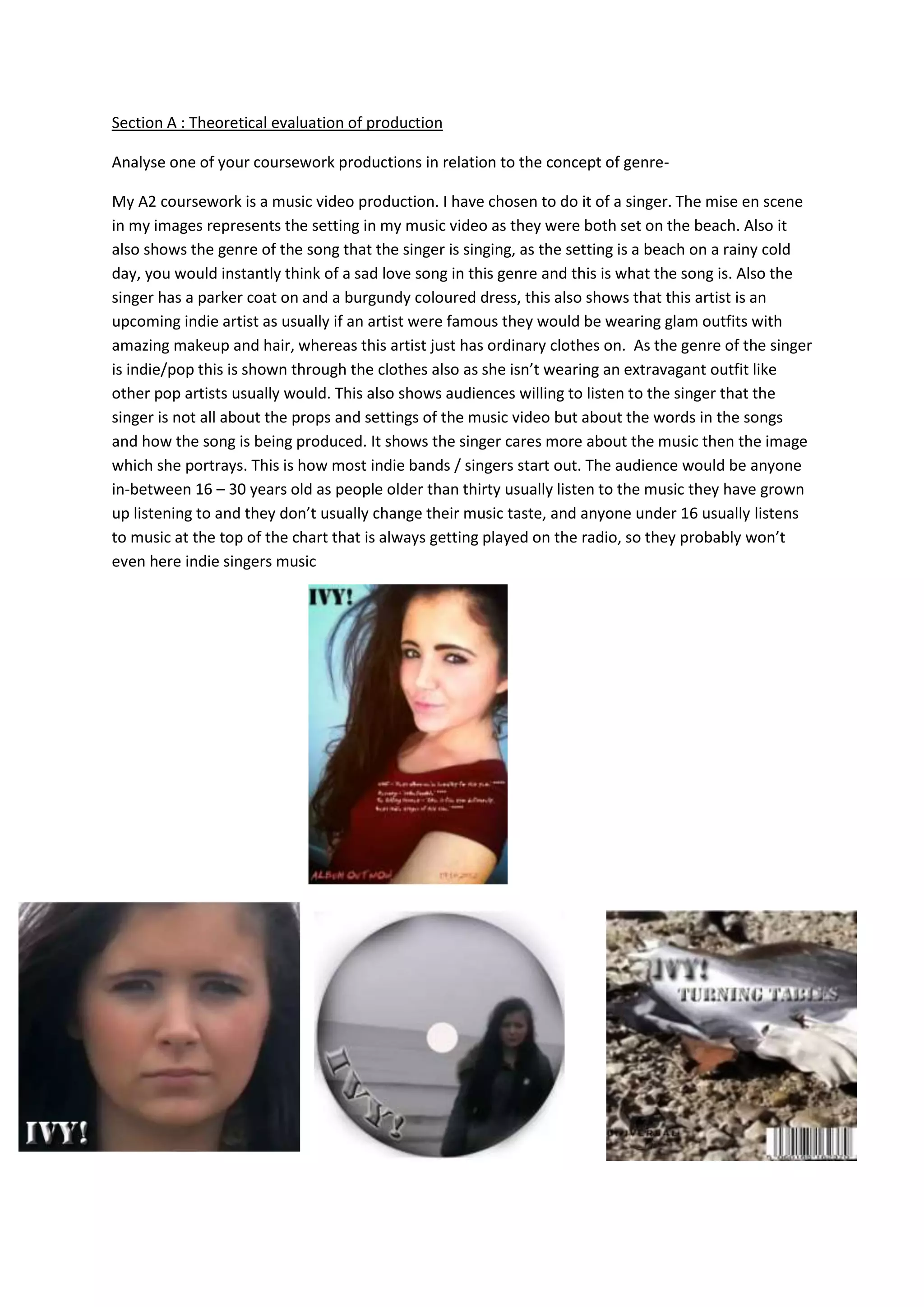 The student analyzes their music video coursework in relation to genre. The video is for an indie/pop singer set on a rainy beach, indicating a sad love song. The singer wears ordinary clothes like an parka and dress, showing they are an upcoming indie artist rather than famous with glamorous outfits. The genre and singer's image focus more on the music than visual props which most indie bands start with. The target audience is 16-30 years old as older audiences stick to familiar music and younger audiences follow top radio hits.