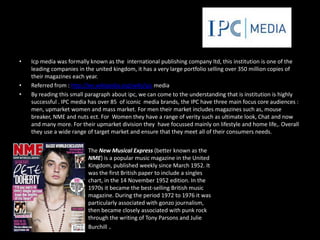 IPC media was formerly known as the International Publishing Company and is one of the leading media companies in the UK, selling over 350 million magazines per year. It has over 85 iconic media brands targeting men, upmarket women, and mass market audiences. The New Musical Express (NME) is a popular UK music magazine published weekly since 1952 that was the first to include a singles chart and was associated with punk rock in the 1970s. EMAP is a British media company that specializes in business-to-business magazines and conferences, focusing on providing information to the business sector. Bauer Media owns over 80 influential brands across various interests like music, lifestyle, and local radio stations.