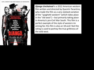 The document discusses three different entertainment properties: Wet, a 2009 third-person shooter video game rated 18 for gore; Django Unchained, Quentin Tarantino's 2012 western film rated 18 for its gritty portrayal of pre-Civil War America; and 5 Ronin, a 2017 Marvel comic limited series featuring Wolverine, Psylocke, Punisher, Hulk, and Deadpool as masterless samurai in 17th century Japan providing insight into that era.