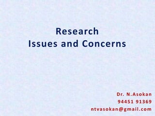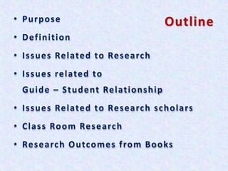 This document outlines issues related to research and class room research. It discusses identifying an appropriate research topic and guide. Finance is a major issue, including costs of experiments, materials, and attending conferences. Identifying the right research topic depends on the guide's specialization and interests of other students. The relationship between guides and students can impact research. Research scholars must develop skills like acquiring knowledge, problem solving, and being lifelong learners with self-discipline. Classroom research examines best practices for teaching-learning processes and evaluating students based on Bloom's taxonomy. Research outcomes from books discuss findings on the 10,000 hours rule for expertise and characteristics of cheating teachers.