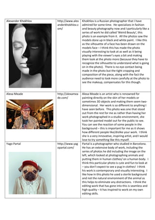 The document provides summaries of and comments on photographs from the websites of various photographers. Some key points made about the photos include: