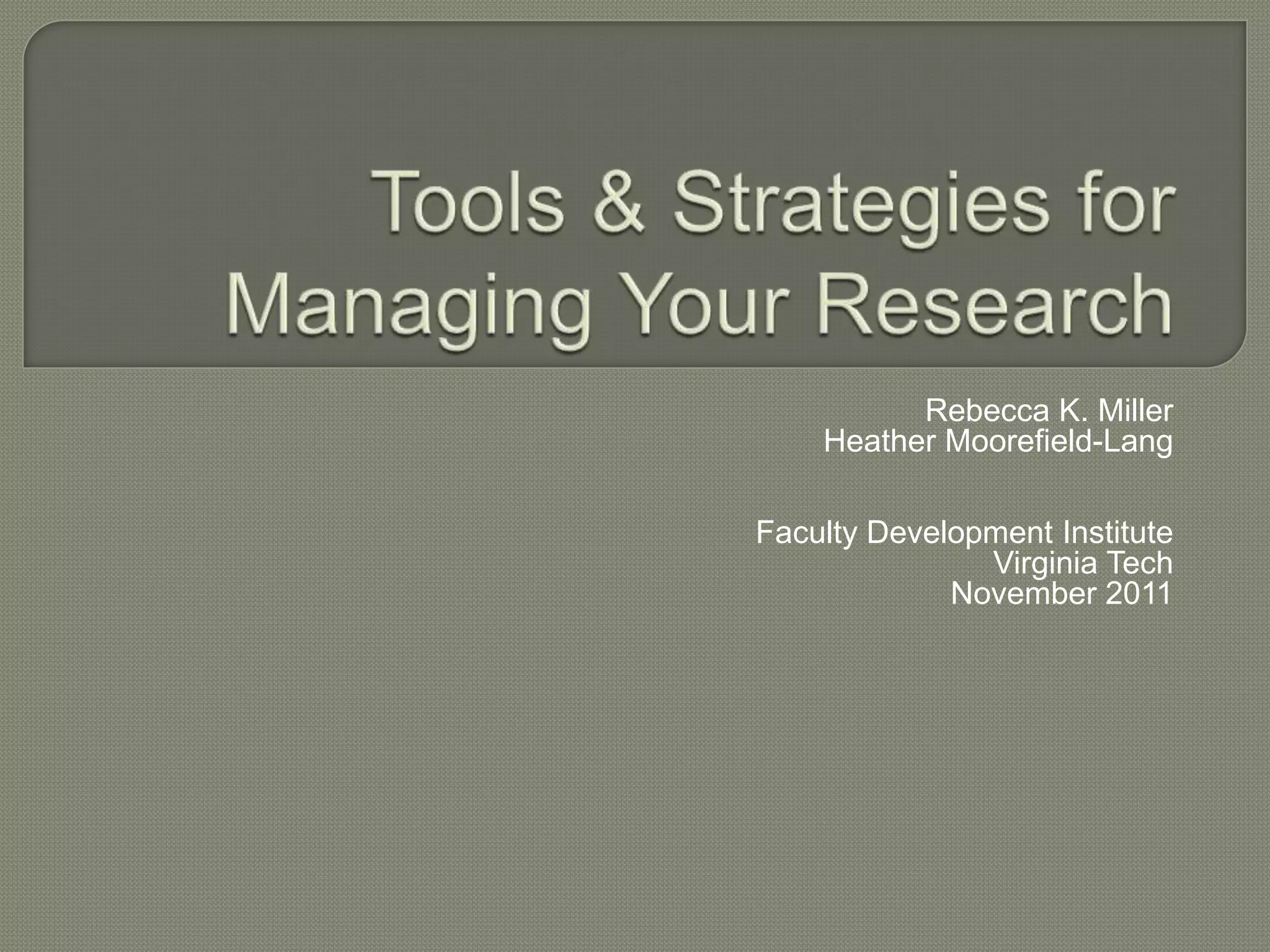 Rebecca Miller and Heather Moorefield-Lang presented on various tools for faculty including citation management tools (Endnote, Zotero, Mendeley), cloud storage options, research tools, task management, and presentation tools. They discussed the strengths and weaknesses of popular citation managers and cloud storage services. They also provided guidance on setting up search alerts and RSS feeds from databases and researchers. A variety of polling, concept mapping, and presentation tools were introduced as well.
