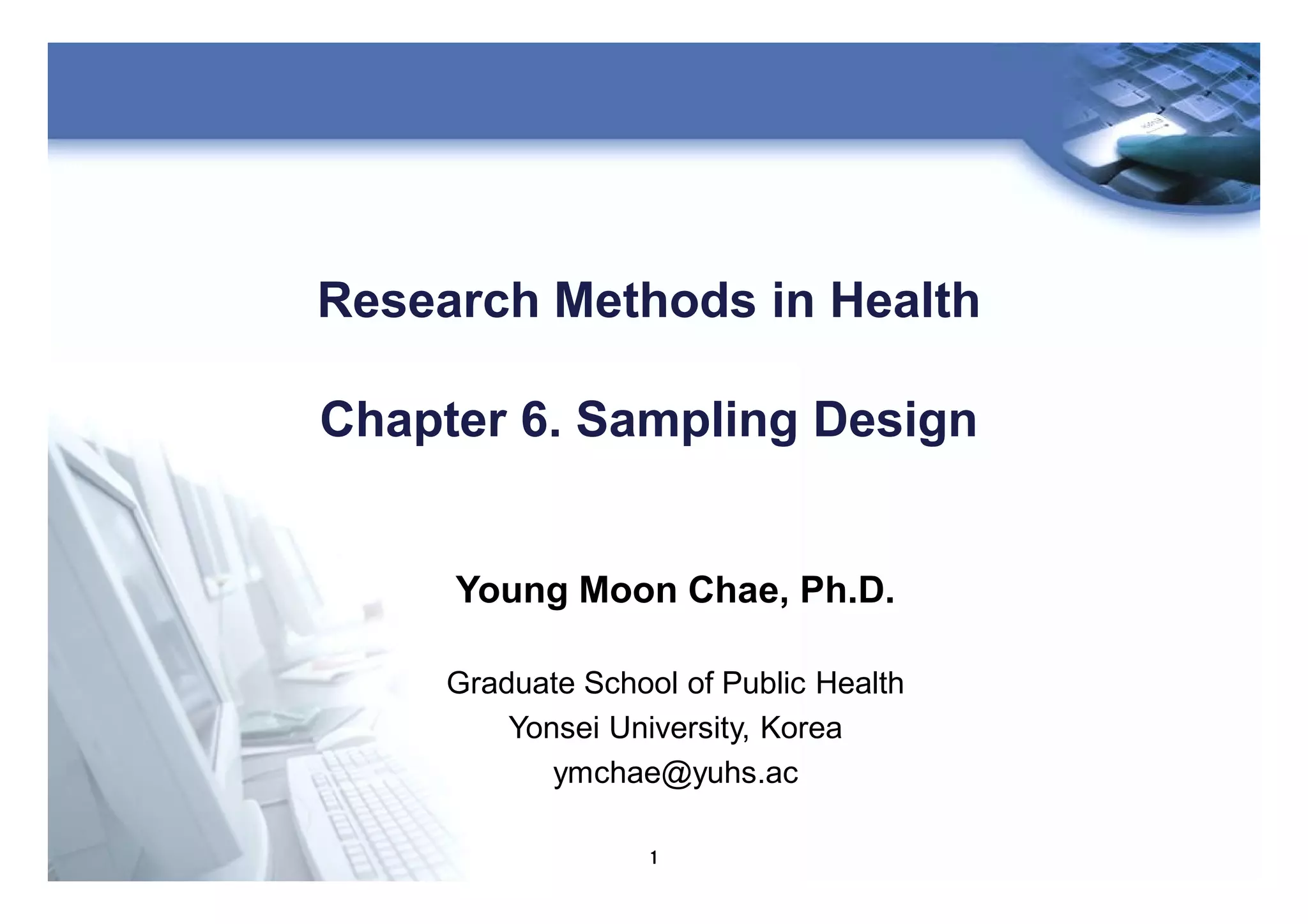 This document discusses sampling design and various sampling methods used in research. It defines key concepts like population, sampling frame, and sampling unit. It also describes different types of probability sampling designs including simple random sampling, systematic random sampling, and stratified random sampling. Non-probability sampling methods like convenience sampling are also briefly covered. The aims and advantages of sampling are to obtain representative results in a timely and cost-effective manner while minimizing bias.