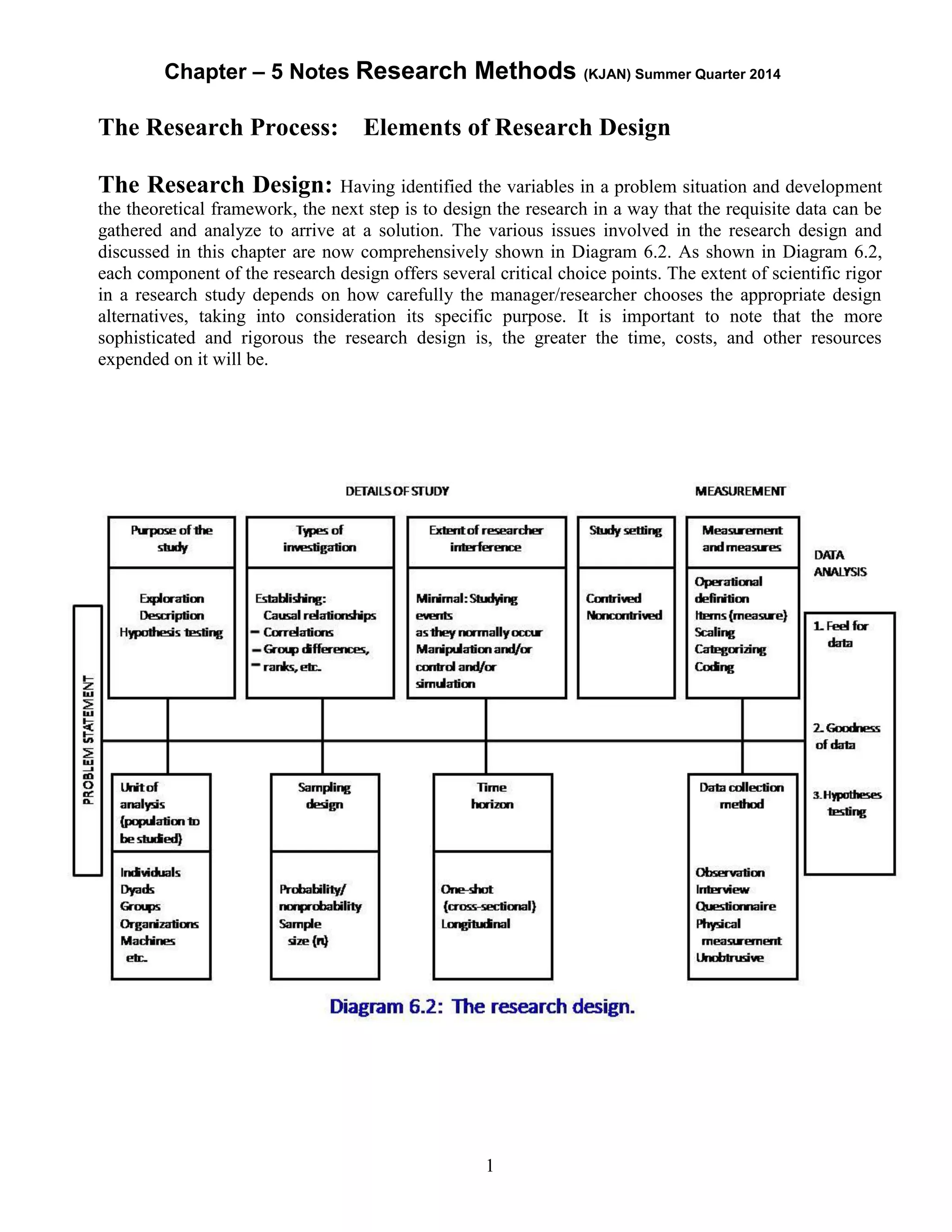 This document discusses key elements of research design and methodology. It covers the purpose of different types of studies including exploratory, descriptive, and hypothesis testing studies. It also discusses variables like the level of researcher interference, study setting (contrived vs non-contrived), and unit of analysis (individual, group, organization). The document uses examples to illustrate concepts like causal versus correlational studies and the trade-off between scientific rigor and cost in research design.
