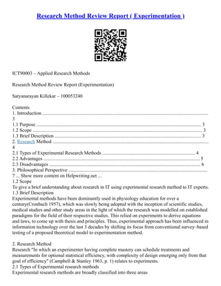 The document discusses different research designs used in experimental studies. It describes exploratory research designs which are used to gain familiarity with a problem and formulate hypotheses. Descriptive research designs aim to describe characteristics of a population or phenomenon. Experimental research designs are used to test hypotheses about relationships between independent and dependent variables. True experiments, quasi-experiments, and correlational designs are discussed as important experimental research designs.