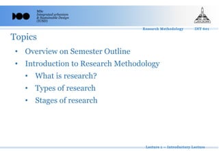 The document outlines the introductory lecture for a course on research methodology. It discusses key topics like the difference between search and research, types of research classified by inquiry method, objectives, applications, and logic, and the stages of research. Research is presented as a systematic process of investigating issues to increase knowledge and arrive at new conclusions, as opposed to simple searching. The course will cover topics such as formulating research problems and questions, research design, data collection, analysis, and reporting findings over its 15 weeks.