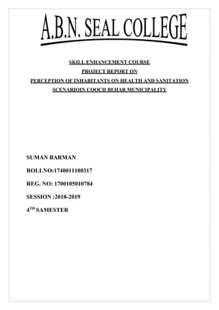 This document is a project report on the perceptions of inhabitants regarding health and sanitation in Cooch Behar Municipality, India. It includes an acknowledgement, research methodology section explaining different research approaches and processes. It then discusses the author's research problem focusing on degraded health and sanitation in Cooch Behar district. The objectives are to examine hygiene conditions, health issues, civic amenities, public reactions, water supply, and prevalent diseases. The literature review covers definitions of urban areas and facilities provided by municipalities. It also gives background details on Cooch Behar Municipality.