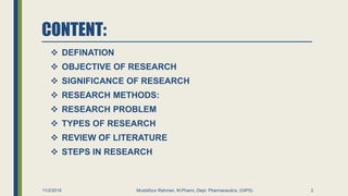 The document outlines research methodology in the context of pharmaceutics, detailing definitions, objectives, significance, and various methods of conducting research. It classifies types of research, including pure, applied, and exploratory studies, while also discussing the importance of literature reviews and the steps involved in the research process. The content provides a framework for understanding how to identify research problems and formulate hypotheses within the pharmaceutical sciences.