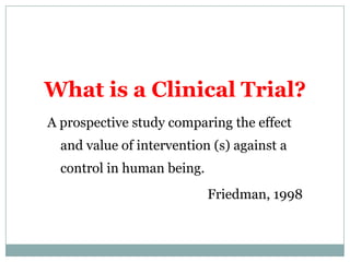 This document provides an overview of the methodology used in clinical trials. It defines key terms like randomized controlled trials, control groups, randomization, and blinding. It describes the various phases of clinical trials including phases 1-3 and post-marketing studies. Phase 1 trials test safety in healthy volunteers while phases 2 and 3 test efficacy in larger patient populations. The goals of each phase are explained as well as important demographic information. The document also outlines the drug development process from preclinical research through regulatory approval and commercialization.