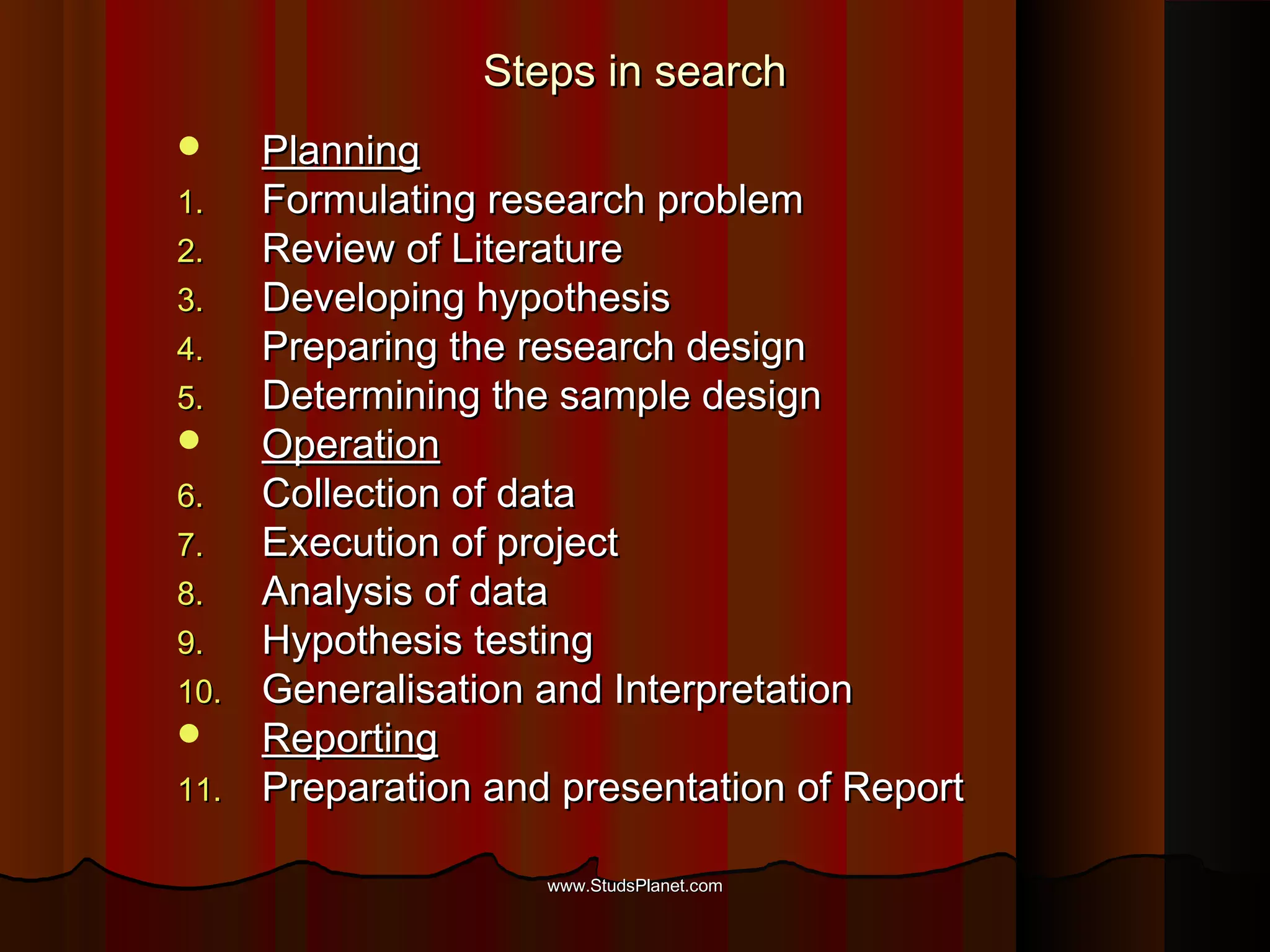 The document outlines the steps involved in conducting research, including planning, operation, and reporting. It discusses formulating a research problem, reviewing literature, developing a hypothesis, preparing a research design, determining sample design, collecting and analyzing data, testing the hypothesis, and generalizing and interpreting results. It also defines a hypothesis as an imaginable, verifiable conclusion that can be tested, and notes that a hypothesis relates theory to observation.