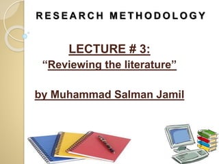 This document discusses literature reviews and their importance in research. It begins by explaining that a literature review is an essential preliminary task that acquaints the researcher with existing knowledge in their field. The functions of a literature review are then outlined as bringing clarity and focus to the research problem, improving methodology, broadening the researcher's knowledge, and contextualizing findings. The document provides guidance on how to conduct a literature review, including searching literature sources, reviewing selected literature, developing a theoretical framework, and creating a conceptual framework. It emphasizes that a literature review is time-consuming but rewarding for strengthening a research study.