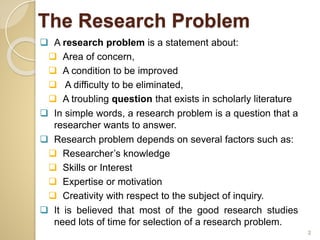 The document discusses formulating a research problem. It states that a research problem is a question that a researcher wants to answer, and depends on factors like their knowledge and interests. The formulation of a research problem is the first and most important step of the research process, as it forms the foundation for the rest of the study. Sources of research problems include people, existing problems, programs, and phenomena in the world. When selecting a research problem, researchers must consider factors like their level of interest, the scope of the problem, their ability to measure concepts, and ethical issues involved.