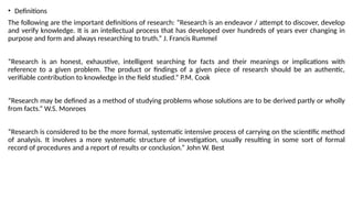 The document explores the concept of research, defining it as a systematic process of inquiry aimed at acquiring knowledge through observation, data collection, and analysis. It discusses various methodologies, primarily focusing on qualitative and quantitative research approaches, including ethnography, grounded theory, and descriptive research, while outlining their characteristics and applications. Additionally, it highlights the distinctions between fundamental and applied research, as well as the significance of empirical evidence in the research process.