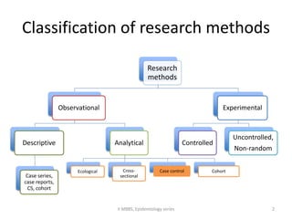 This document discusses case control studies, an observational study design that compares individuals with a disease or condition (cases) to individuals without the disease or condition (controls) to determine associations between exposures and disease outcomes. It provides an overview of key elements of case control studies, including the selection and matching of cases and controls, measurement of exposure, analysis using odds ratios, potential biases, advantages and disadvantages compared to cohort studies, and examples of case control studies conducted.