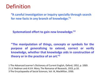 The document discusses research methodology, outlining its definitions, various types, and approaches such as qualitative vs. quantitative and applied vs. fundamental research. It emphasizes the importance of systematic investigation and the components necessary for conducting research, including data collection, analysis, and report writing. The significance of research in fostering scientific thinking and addressing real-world problems is also highlighted.