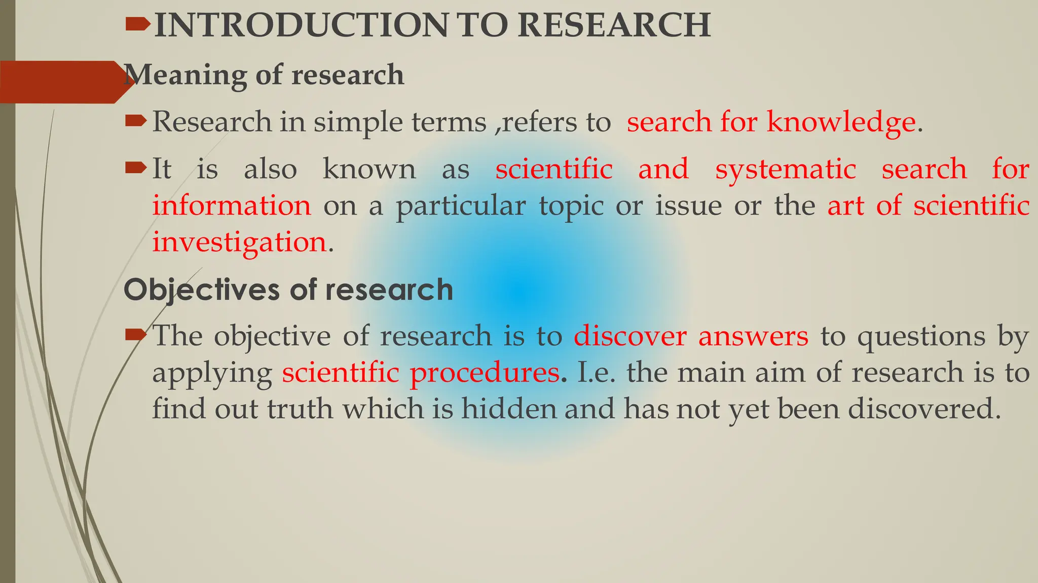 The document provides a comprehensive overview of research, its objectives, methodologies, approaches, and types. It highlights the significance of conducting research systematically and describes the steps involved in the research process, including problem formulation and research design. Additionally, it discusses various types of research frameworks, such as qualitative vs. quantitative and applied vs. fundamental research.