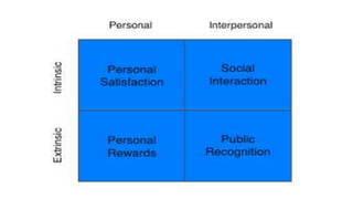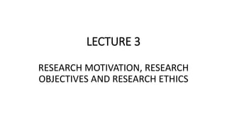 The document outlines the motivations for conducting research, highlighting intrinsic, extrinsic, personal, and interpersonal factors that influence researchers. It also discusses the importance of clear research objectives to guide studies and emphasizes research ethics, including honesty, objectivity, and respect for intellectual property. Additionally, the document stresses the significance of maintaining researcher motivation through recognition, challenges, and skill development.