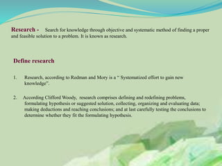 The document provides an overview of research methodology. It defines research and describes the objectives and qualities of a researcher. It discusses three main research methods: survey method, case study method, and ex post facto method. It also outlines different types of research such as applied research, analytical research, descriptive research, and experimental research. The document then describes the research process which includes formulating the research problem, literature review, developing hypotheses, research design, sampling, data collection, data analysis, hypothesis testing, and preparing the thesis. It also discusses techniques for defining a problem and important concepts related to research design such as variables, experimental and control groups. Finally, it provides definitions of key terms like pre-test, pilot survey, and discusses