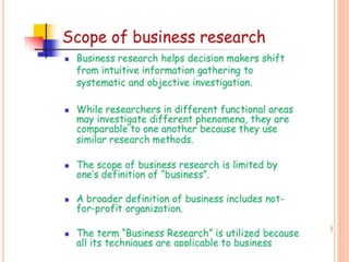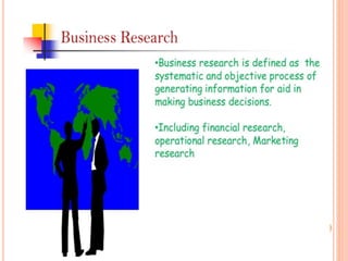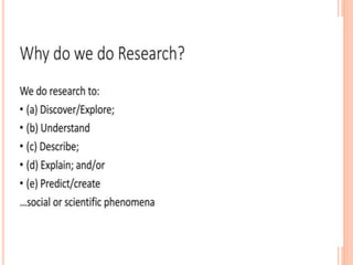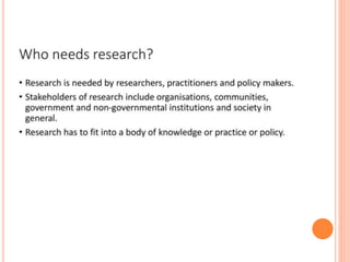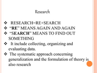 Research involves systematically collecting, organizing, and evaluating data. It aims to gain new knowledge and formulate theories through careful study. There are various types of research including descriptive, analytical, quantitative, qualitative, applied, and fundamental research. Descriptive research reports on what is happening without seeking to explain why, while analytical research involves in-depth evaluation to make critical assessments. Quantitative research relies on measurement and statistics while qualitative examines non-numerical data. Applied research seeks solutions to practical problems, and fundamental research expands theoretical understanding. The objectives, approaches, and significance of research were also outlined in the document.