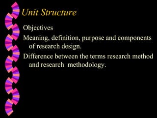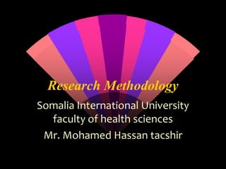 The document outlines the research methodology taught at Somalia International University for the Faculty of Health Sciences, detailing the components and significance of research design, methods, and proposals. It emphasizes the purpose of research design as a structured approach to addressing research questions and issues, while distinguishing between research methods and research methodology. Additionally, it covers essential elements of a research proposal including the identification of topics, literature review, rationale, variables, research questions, significance, data analysis techniques, time frame, and budget considerations.