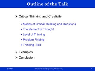 The document discusses critical thinking and creativity, outlining critical thinking's definition, modes, and levels, along with various mental abilities and strategies involved in problem-solving. It emphasizes the importance of skills such as interpretation, analysis, evaluation, inference, and explanation, while also highlighting creativity as the ability to generate new ideas and solutions. Additionally, it covers techniques for problem finding and solving, methodologies, and the development of thinking skills necessary for fostering innovative minds.