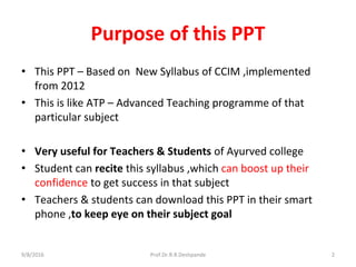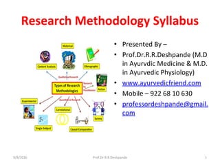 This document outlines the syllabus for a Research Methodology course, including objectives, topics covered, and reference materials. The syllabus is divided into two parts: Part A covers research methodology concepts like the history of research, types of research, the research process, and the role of ethics and technology in research. Part B focuses on medical statistics, including key terms, data presentation, measures of central tendency and variability, probability, and statistical tests. The course aims to provide students and teachers with knowledge and skills for conducting research in Ayurveda.