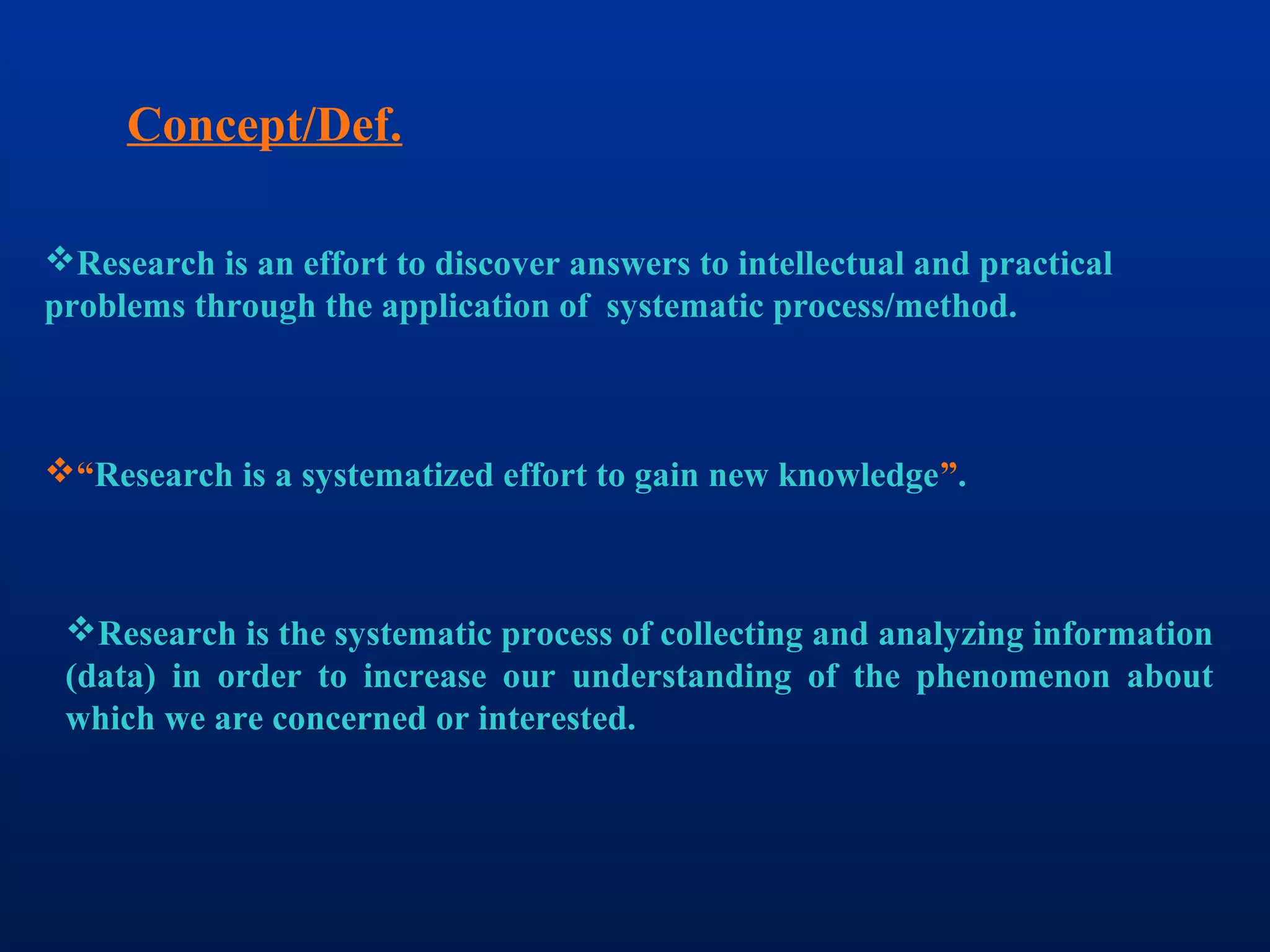 The document discusses research methodology and process. It defines research, outlines the objectives and characteristics of research, and describes the different types of research. It also discusses defining the research problem, formulating research objectives, and the overall steps involved in the research process from reviewing literature to data analysis and reporting findings.
