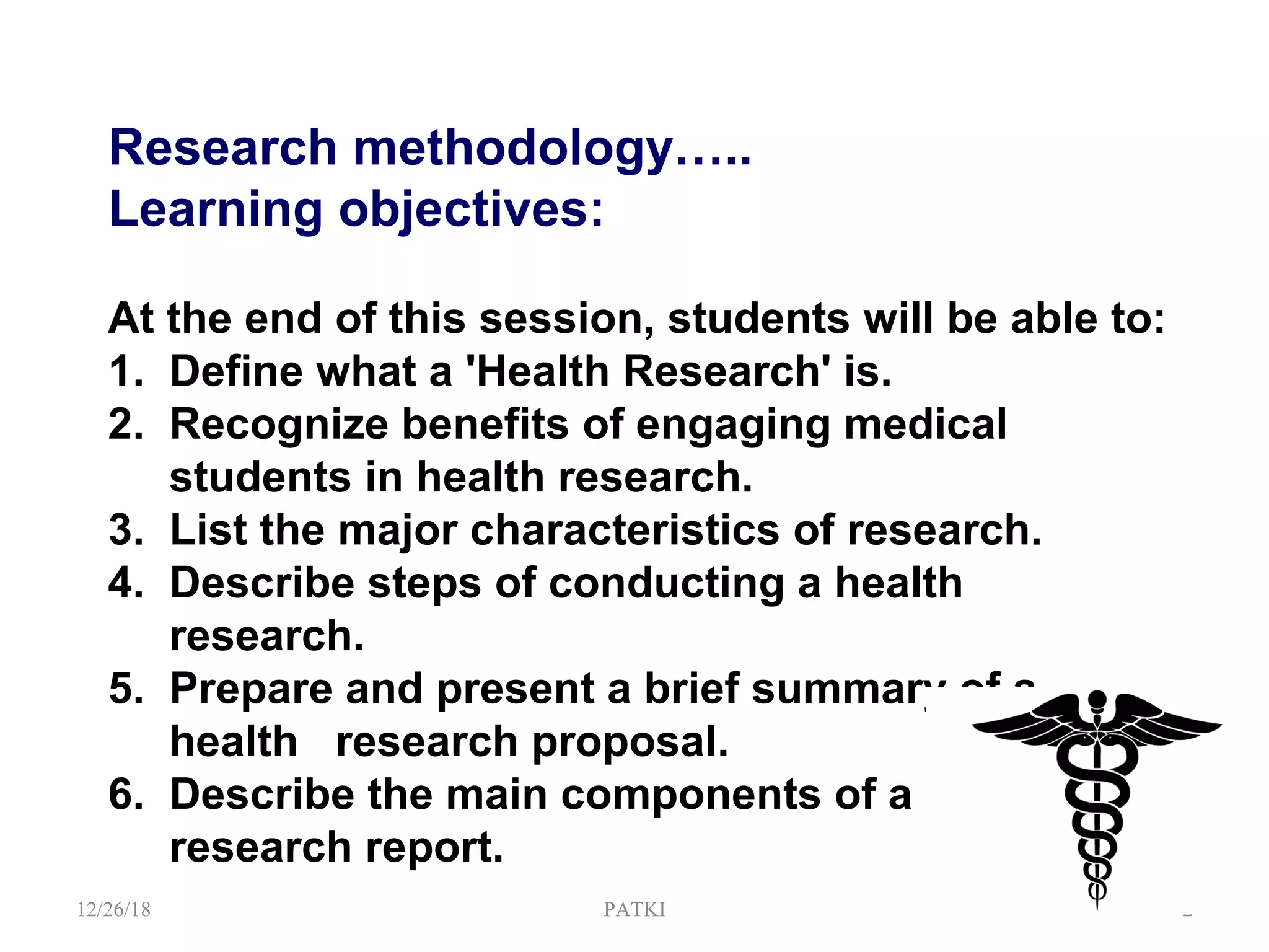 This document provides guidance for medical students on conducting health research. It outlines the key steps in the research process, including developing learning objectives and a research proposal. The proposal involves selecting a topic, reviewing existing literature, developing objectives and hypotheses, and detailing the methodology, work plan, and dissemination of results. The document also reviews best practices for writing a final research report, which consists of components like an abstract, introduction, methodology, results, discussion, and conclusions. The overall document serves to introduce medical students to the basics of the health research process.