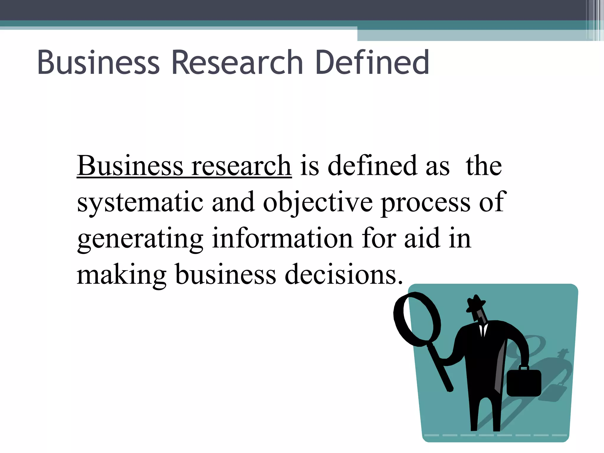 Business research is defined as the systematic and objective process of gathering information to aid business decisions. There are two main types: basic research which expands knowledge without addressing specific problems, and applied research which answers questions about real problems. The scientific method is used in both, involving problem identification, research design, data collection and analysis, and conclusions. Statistics help summarize and analyze data. Business research should be conducted when it can provide valuable insights in a timely and cost-effective manner to inform important strategic or tactical decisions.