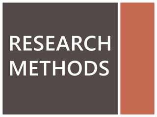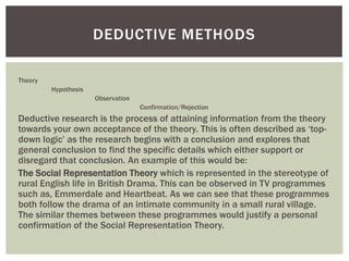 This document outlines different research methods. It discusses deductive research, which starts with a theory and tests it, versus inductive research, which starts with observations and builds to a theory. It also differentiates between quantitative data, which can be measured numerically, and qualitative data, which involves studying social phenomena through methods like interviews and case studies. Finally, it lists some common sources and methods used in research, such as libraries, the internet, written works, interviews, surveys, and conversations.