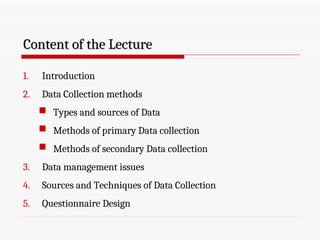 The document discusses the sources and methods of data collection in accounting and finance research, emphasizing the importance of accurate data for quality research outcomes. It distinguishes between primary and secondary data, outlining various collection methods such as surveys, interviews, and focus groups, while also addressing data management issues like storage and confidentiality. Additionally, it highlights the significance of planning and executing data collection strategies to avoid bias and ensure the integrity of findings.