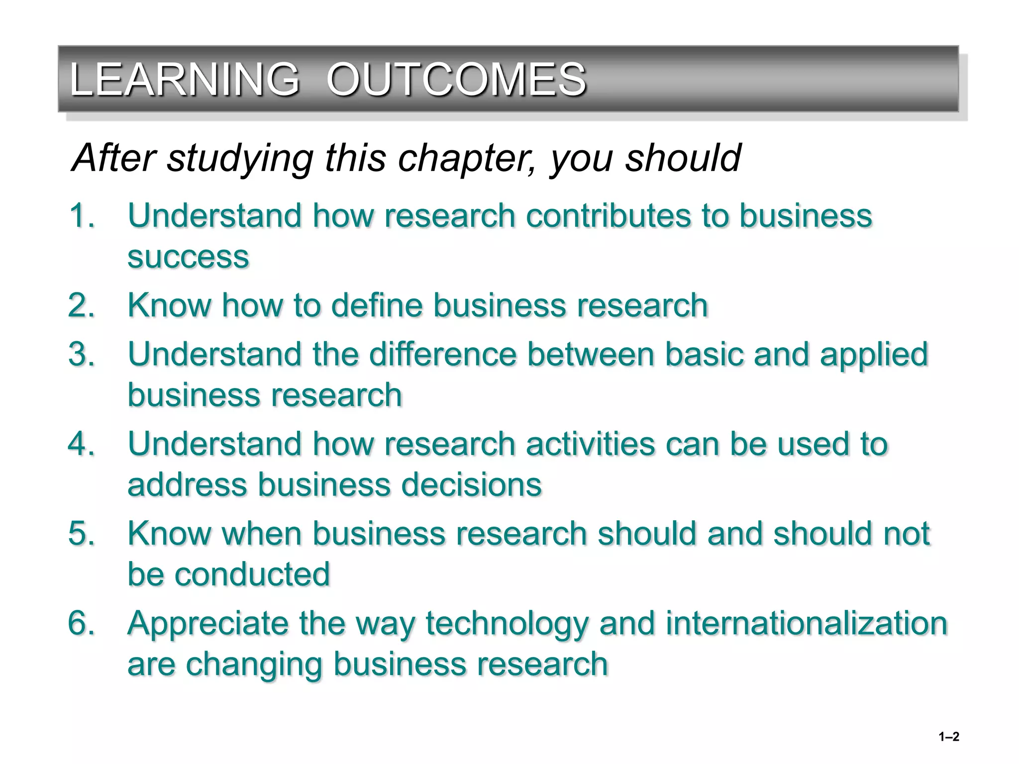 This document provides an overview of business research. It defines business research as the systematic and objective process of generating information to aid in business decision making. This includes problem definition, information collection and analysis, and communicating findings. Business research can be applied to address specific decisions or basic to expand general knowledge. The scientific method involves forming hypotheses and using evidence to objectively reach conclusions. For managers, research helps with strategic planning, problem identification, decision making, and evaluating outcomes. The value of research must exceed its costs for a project to be worthwhile. Key topics include general business, finance, management, and marketing. Technology and globalization are changing how research is conducted.