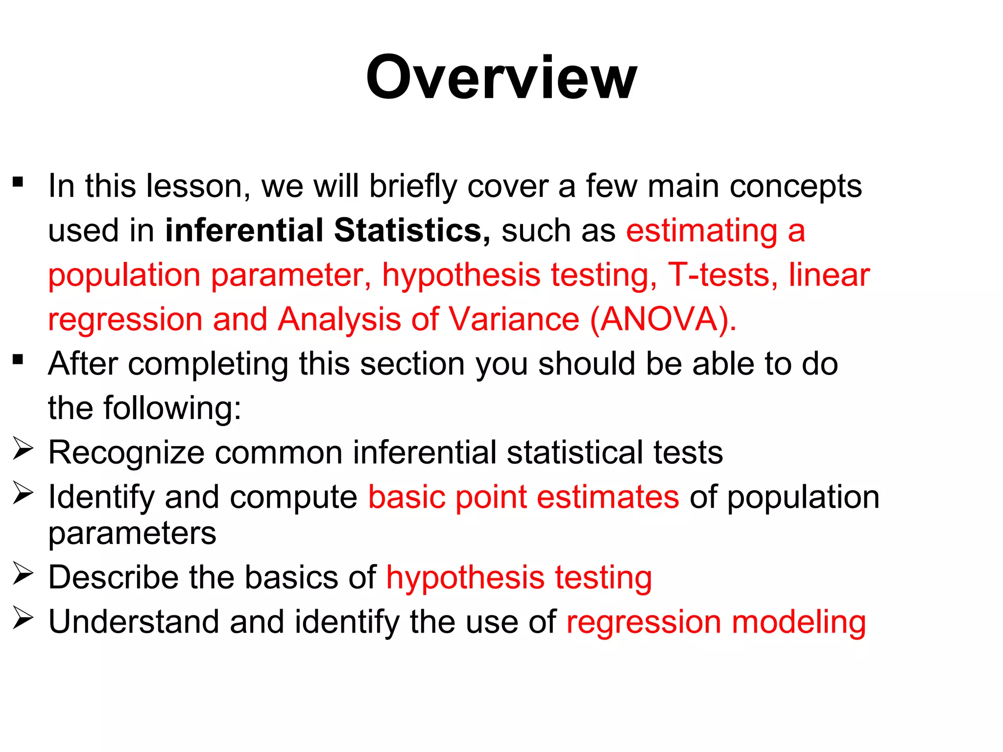 This document provides an overview of key concepts in inferential statistics including parameter estimation, hypothesis testing, t-tests, linear regression, and analysis of variance (ANOVA). It defines important statistical terms like population parameter, point estimate, confidence interval, null and alternative hypotheses, type I and II errors, and significance. Common statistical tests covered include the one sample t-test, independent two sample t-test, and tests assumptions. Linear regression models and correlation are also discussed including the regression line, coefficient of correlation, and coefficient of determination.