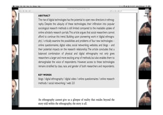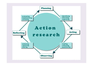 This document discusses various methodologies used in qualitative research, including action research, ethnography, and reflexivity. It provides an overview of key aspects of these methodologies such as their basic steps, processes of reflection and action, aims to understand perspectives from within a setting, and use of thick description. The document also discusses data collection techniques, issues of validity, and how reflexivity requires acknowledging the interactions and perceptions that shape research relationships.