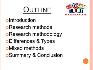 This document discusses research methods and methodology. It defines research methods as the specific techniques used to collect data, such as surveys, experiments, and interviews. Research methodology refers to the overall strategy and approach used in a research study. The document outlines different types of research methods, both qualitative and quantitative. It also describes various mixed methods approaches that combine qualitative and quantitative data.