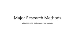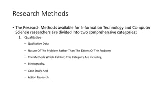 The document outlines major research methods in information technology and computer science, categorizing them into qualitative and quantitative approaches. Qualitative methods include ethnography, case studies, and action research, focusing on understanding social interactions, while quantitative methods involve surveys and experimentation that yield numerical data. The document discusses the merits and demerits of each method, highlighting their applications and challenges.