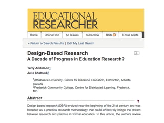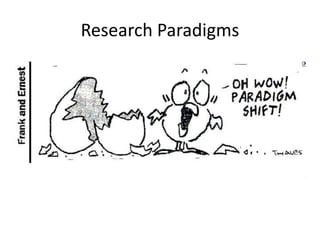 This document discusses four main research paradigms: positivism, interpretivism/constructivism, critical, and pragmatic. It provides an overview of the key aspects of each paradigm, including their ontology (nature of reality), epistemology (nature of knowledge), typical research questions, and common methodologies. The document uses examples from educational technology research to illustrate different studies that fall within each paradigm. Overall, it analyzes the tradeoffs of different paradigms and argues that the choice depends on personal views, the research question, available resources, and supervisory support, with no single best approach.