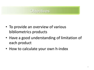 This document provides an overview of various bibliometric products and metrics that can be used to measure research impact, including journal impact factor, h-index, citation counts, and journal/article ranking tools from Journal Citation Reports, Scopus, and Google Scholar. It discusses the purpose and calculations of metrics like impact factor, eigenfactor, and source normalized impact per paper (SNIP). It also covers limitations of bibliometrics and recommends using multiple metrics and tools to evaluate research. Exercises are provided to help understand how to analyze journals, articles, and individual researchers using different bibliometric resources.