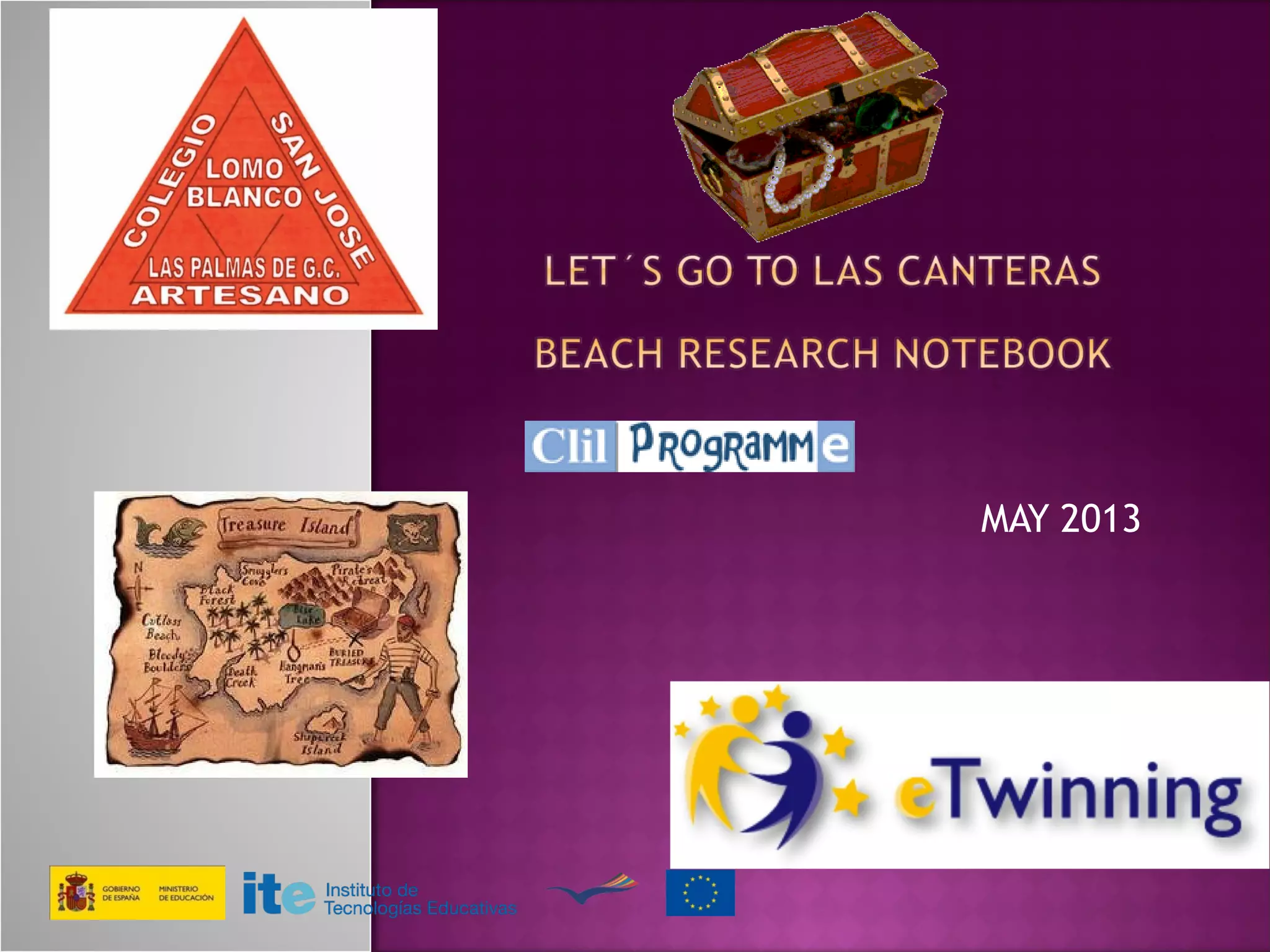 The document provides details about a field trip taken by students on May 13th, 2013 to Gran Canaria, Spain. It notes that it was sunny and cloudy around 22 degrees, and the beach had a green flag indicating safe swimming and a blue flag for being very clean. The students took a bus to various locations, including a music hall, beach to pick up stones and litter, and rock pools for pond dipping. They then took the bus back to school.