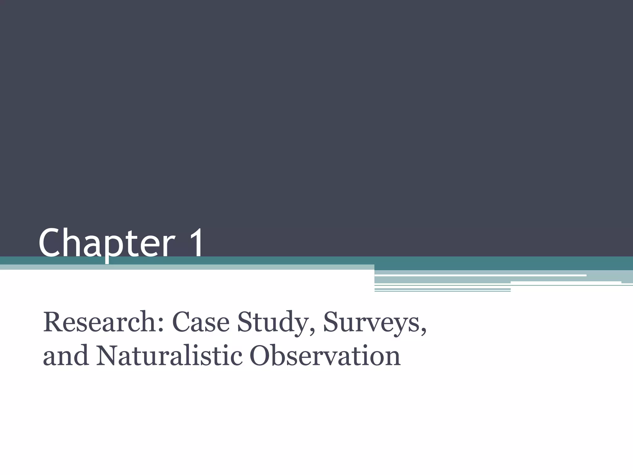 This document summarizes and discusses several research methods used in psychology: case studies, surveys, and naturalistic observation. It notes that case studies examine individuals in depth but results may not generalize, while surveys can gather data from many people but are impacted by question wording and require representative samples. Naturalistic observation involves watching and recording behavior in natural environments. It also defines correlation as a measure of how two factors vary together, distinguishing between positive and negative correlations, and noting correlation suggests prediction but not causation.