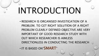 The document outlines the importance of clearly defined research objectives in guiding investigations effectively. It categorizes research objectives into general and specific types, emphasizing their roles in measuring variables and providing structured direction. Additionally, it presents a format for developing objectives related to identification, description, relationships, and differences among variables within specified populations.